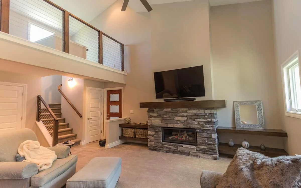 Ventures built this spacious, high-ceilinged addition connecting the main house to the garage. The living room's centerpiece is a modern gas-fueled fireplace that can be turned on and off with the flip of a switch. It is set into a stone veneer wall with a TV above the mantel and built-in shelving to either side. The stairway up to the mezzanine features a custom wood handrail and wood-framed cable railing overlooking the lounge below.